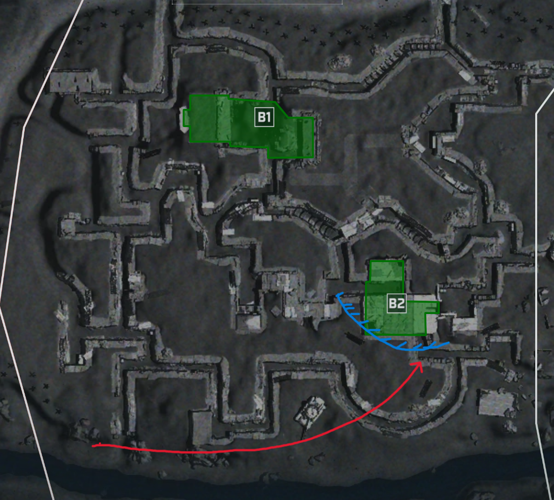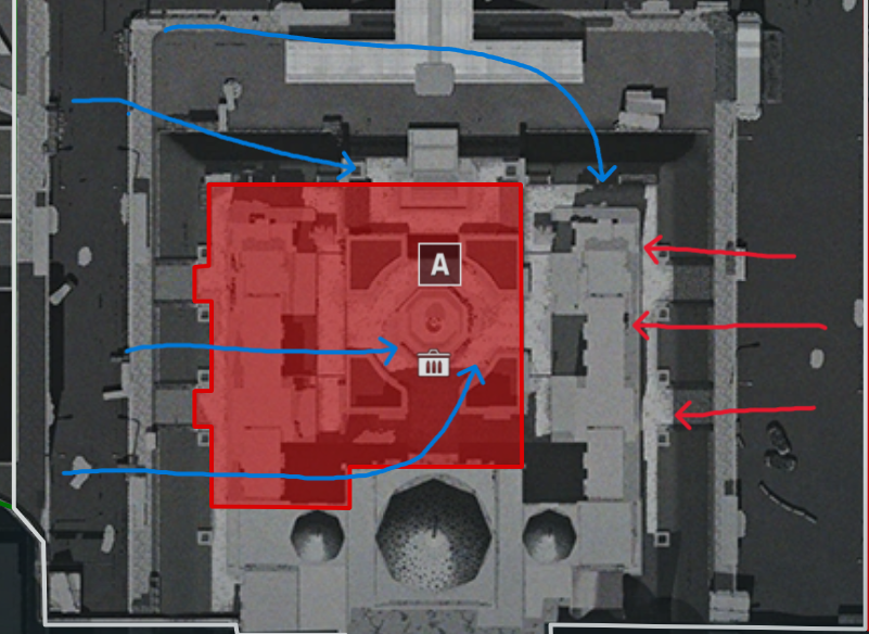 作为进攻方,如图,最显然的例子就是单点区域的进攻,以临界点A区为例,区域内一旦被肃清,防守方复活点受挤压后移,便只能通过劣势地形沿红色箭头进行回防反清。此时,通过对场上占领读条的观察,指挥官便可以在读条最后一刻,确保万无一失地下一个高价值目标命令,在极短时间内稳稳吃下一波高价值分数奖励。这便是一种“合适的”高价值目标标记。