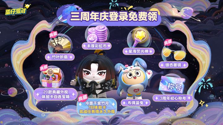 3周年福利提醒📢现在上线,给每人送一份价值500+元的免费蛋选卡,包含全新典藏外观<冷面千金竹月>免费得、84枚彩虹币、110+元抽奖抵扣券和7大玩法好礼等惊喜!