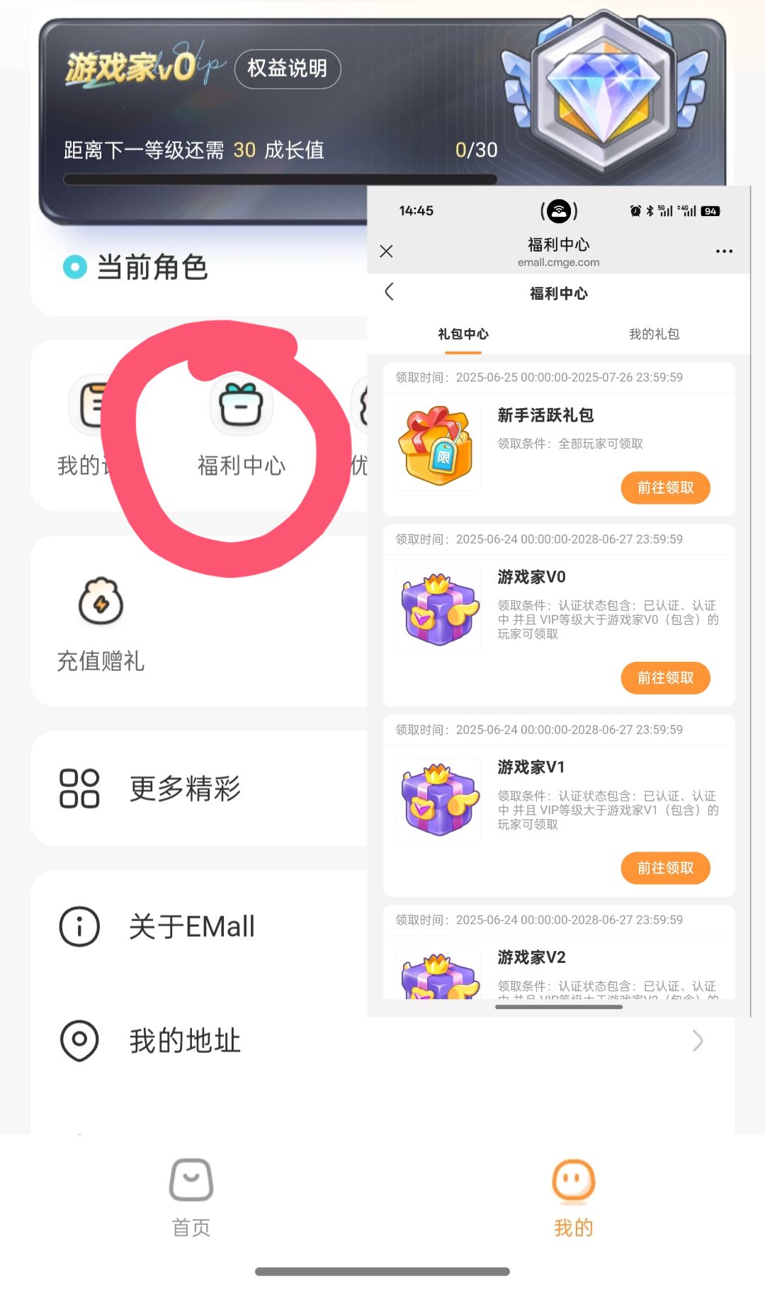 然后在我得福利中心领取,有的有VIP等级限制。