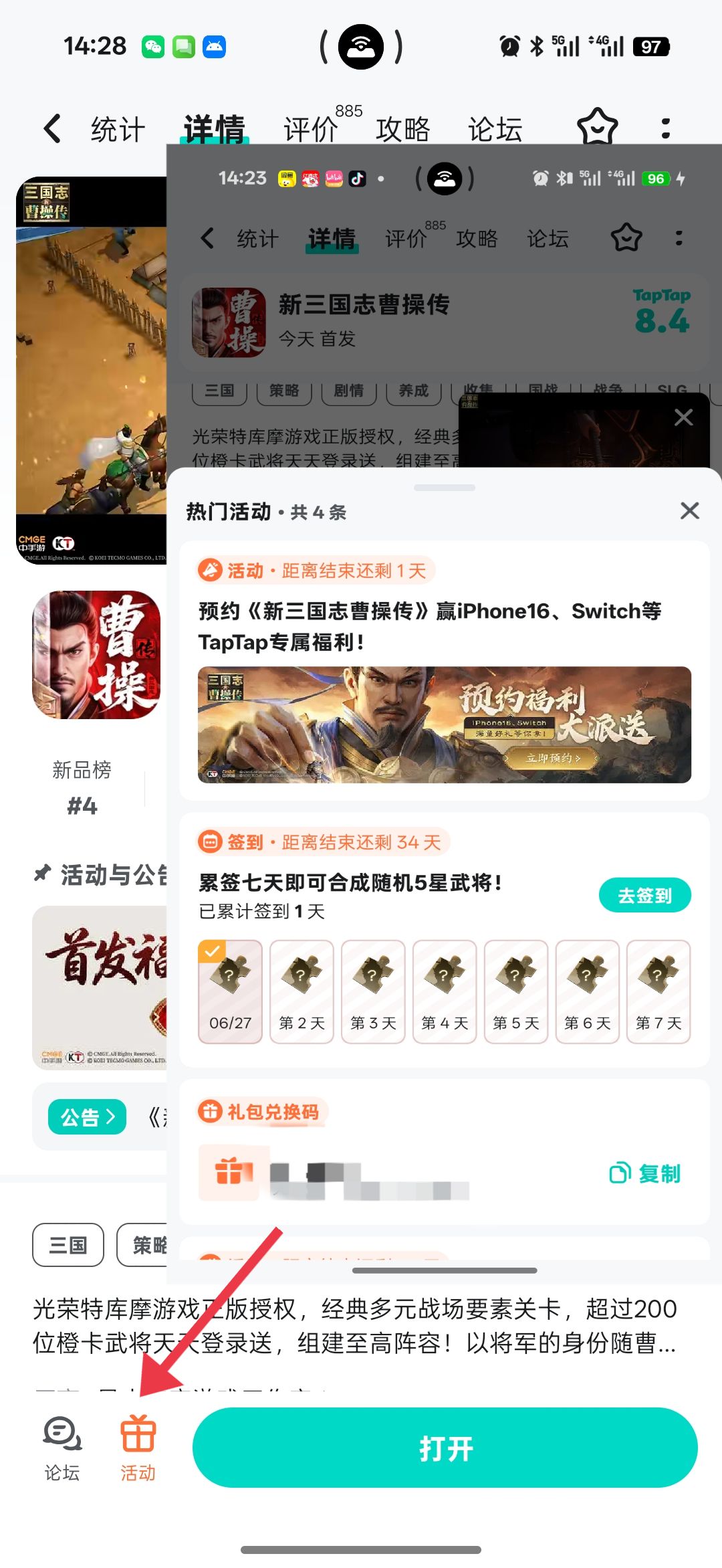 游戏下方的礼包进入,几个活动都可以参加,然后也会给到礼包码