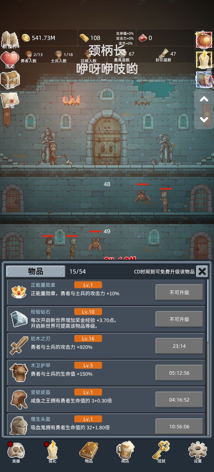 点勇士,点最高层,攒钱升科技,那个勇士加佣兵总伤百分比的。然后一直在最底层点勇士,到三十秒到一分钟都打不到下一层时,往上衣两层打金,打金开新佣兵加勇士攻击