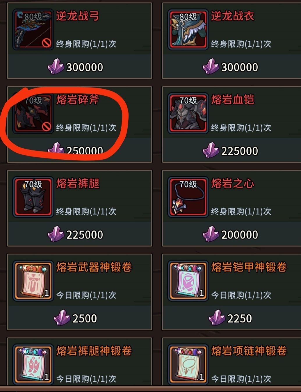 ②——无尽深渊尽量爬塔拿结晶,兑换防具碎片和材料,优先做成熔岩刀刀或者狂血裤子,熔岩刀10%吸血血对于前期很有用。
