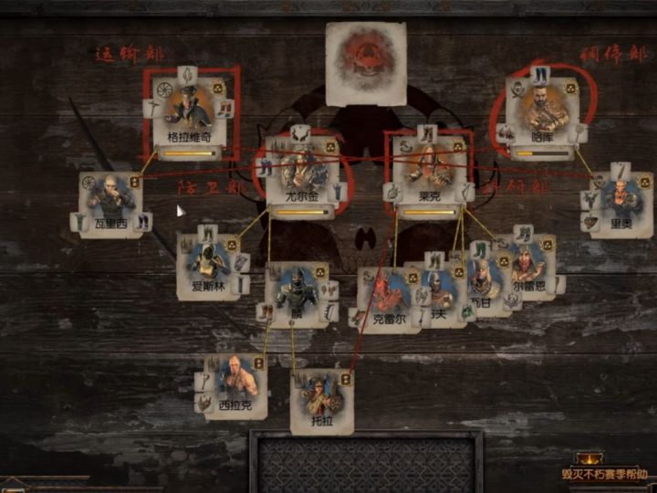 2、底下的是成员,红框的是头领,最上面中间的是主脑。红线互相仇恨,黄线同部门,绿线互相信任。