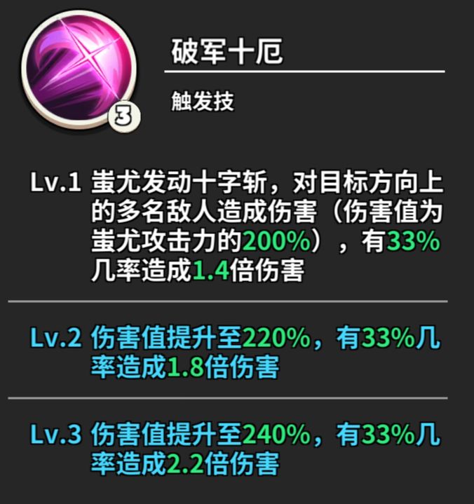 蚩尤发动十字斩,对目标方向上的多名敌人造成伤害,并有一定几率造成多倍伤害