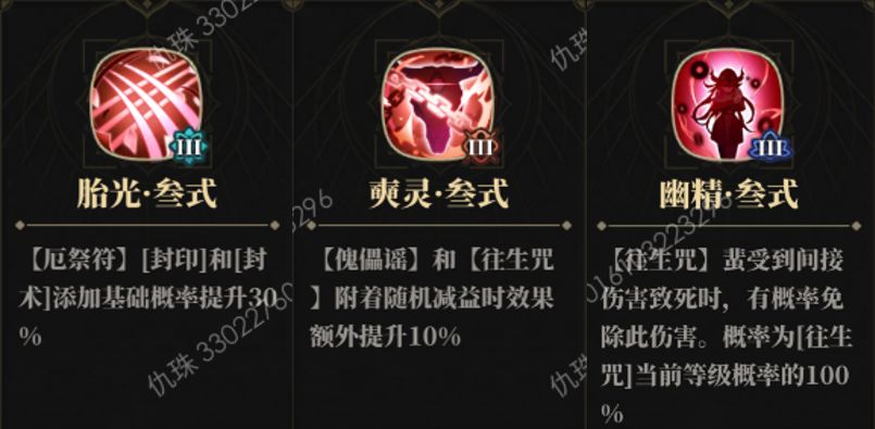 「往生咒·寂」:往生咒触发时,将使敌方全体受到间接伤害提升50%,并有100%的概率使其进入「傀儡咒-寂」状态,持续1回合。若目标已经进入「傀儡咒-寂」状态,则会使其遭受最大生命值80%的伤害(不超过蜚攻击力1000%),若目标被此次攻击击败则会被直接斩杀(无视免死)。