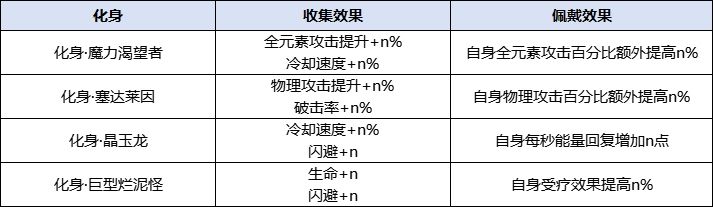 化身类似于是角色的“外挂型”加成来源,不光可以额外佩戴四个技能,还能提供属性加成。虽只能佩戴1个,但收集本身也能带来属性提升,所以就算没有佩戴战斗的化身,也可以进行养成强化,适合长期养成。给大家举例: