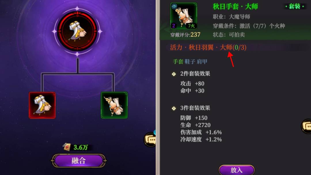 仅能相同部位进行合成,且触发套装效果的需要同品质的套装,如下图;需要手套、鞋子、肩甲套装均为大师品质