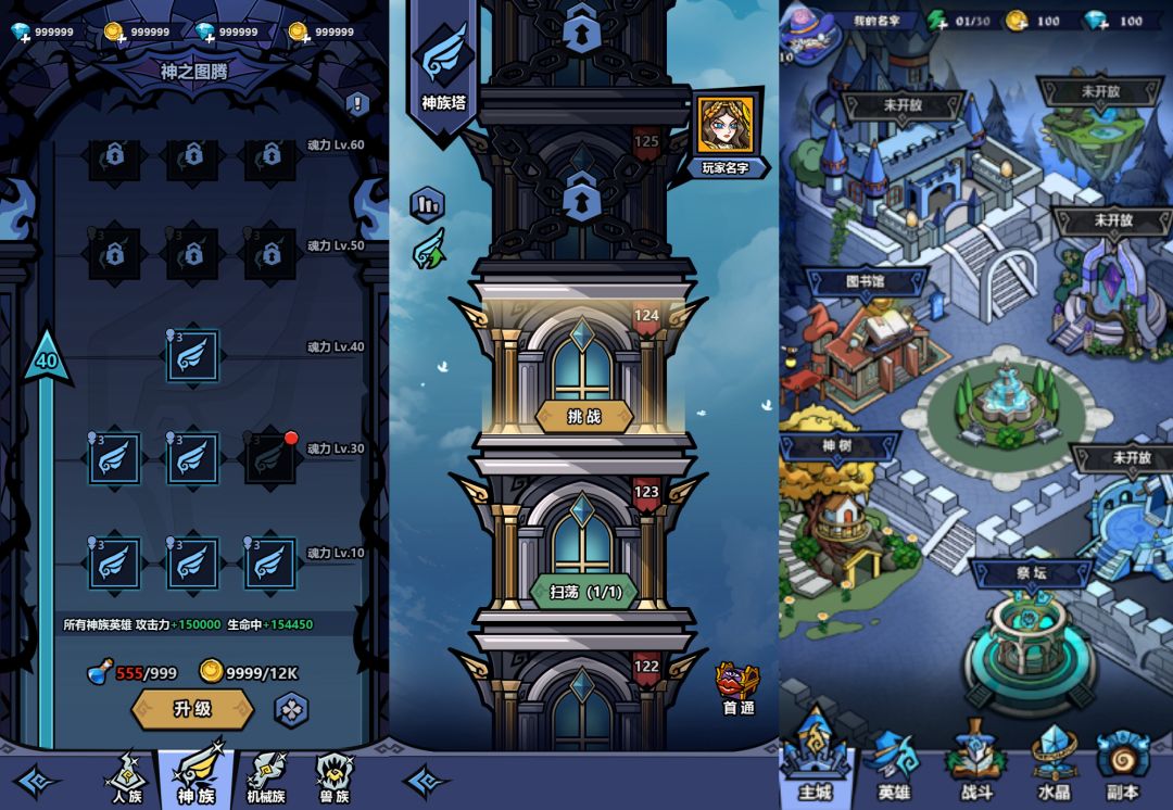 包括神族、人族、兽族、机械族等,每种塔上阵对应种族可加10%攻击力和10%的血量,且各塔有不同开放时间。同时,四个种族的魂晶用于升级新的养成系统,还有魂石、黄金卷轴、狗粮等要素,种族塔有羁绊BUFF。