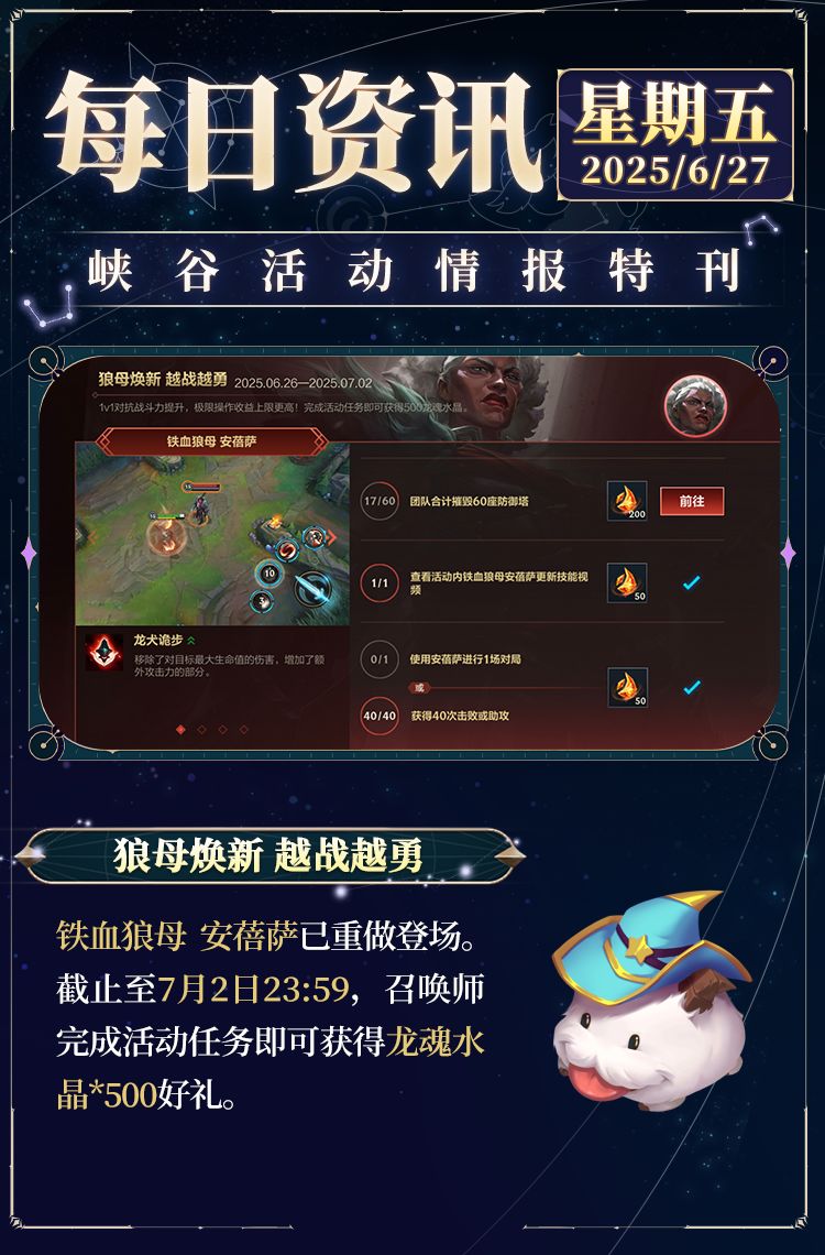 铁血狼母 安蓓萨重做登场!截止至7月2日23:59,召唤师完成活动任务即可获得龙魂水晶*500好礼。