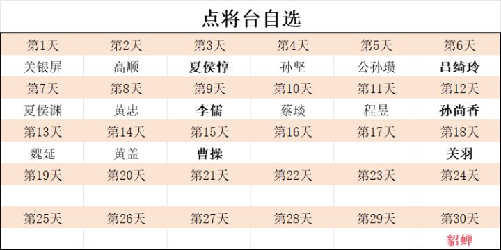 每天的点将台前期自选比较重要,附图是建议选择顺序,关银屏无疑是首发率最高的;第二天需要选择一个能击退(高顺)或者带冲撞(黄盖),二者选一,用来开局打蔡琰之影和曹仁之影【禁疗建议带紫卡神将马腾,徐晃则狗都不练】;孙坚有虎啸,公孙瓒有黩武,在前期可以提供增益加持,可以优先考虑上;第七天解锁弓骑后三神射优先,第九天解锁稀有再上曹操和关羽