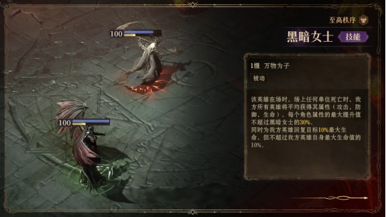 而黑暗女士的被动技能"万物为子"又赋予了她独一档的战场统治力。每当有单位阵亡时,我方全体英雄都能继承其部分属性(最高不超过黑暗女士属性的30%),同时恢复相当于目标最大生命值10%的血量(不超过自身最大生命值的10%)。这种越战越强的机制,配合能同时削弱多个敌人的"龙神惩戒",使得黑暗女士成为了扭转战局的绝对核心。