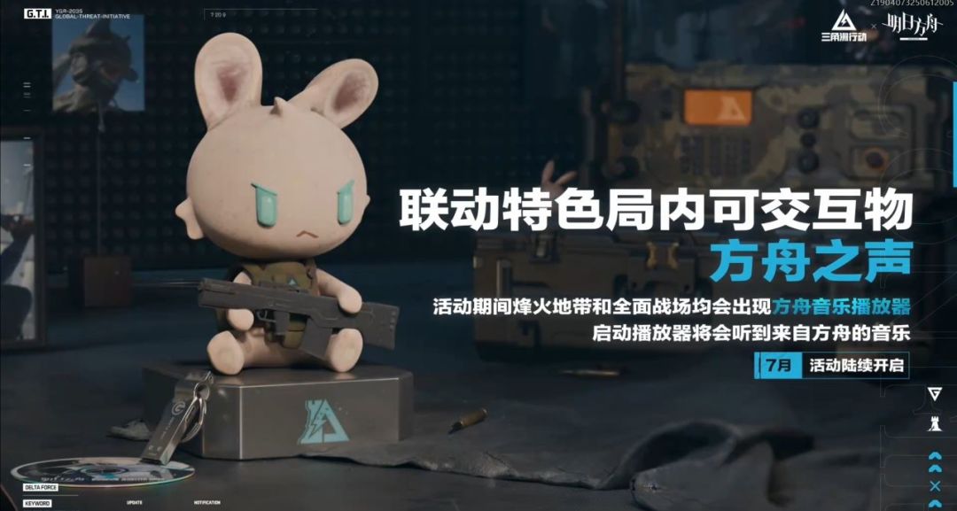 联动特色局内可交互物,方舟之声。活动期间烽火地带和全面战场均会出现方舟音乐播放器,启动播放器将会听到来自方舟的音乐。