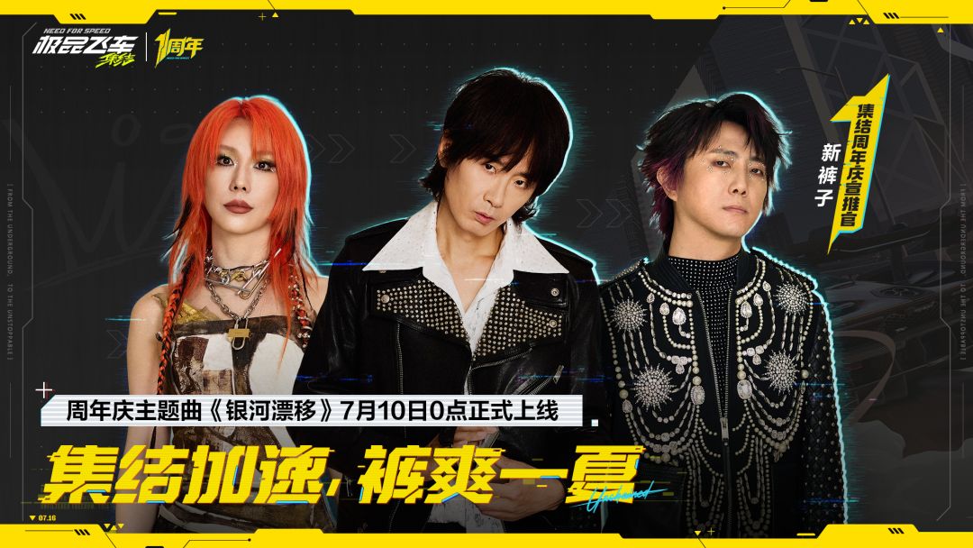 新裤子出任集结周年庆宣推官,为《极品飞车:集结》量身打造周年主题曲《银河漂移》。这首热血单曲将于7月10日0点正式上线,随着新版本更新,《银河漂移》以及《悲伤朋克》也将同步加入游戏歌单,让新裤子的躁动旋律点燃热湾的速度与激情!