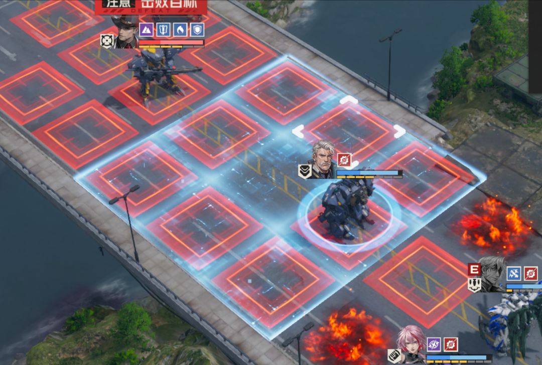 接着科林还有一个类似于“警戒区域”的地形施加技能,这个地形的优先级还是挺高的,因为不管是艾琳的火焰地形还是提费斯的战略领域,这个区域封锁地形都可以轻松的覆盖,但反过来艾琳的火焰地形是无法覆盖区域封锁的,而提费斯的战略领域就有点意思了......虽然从视觉上来讲看起来有点类似于共存的,但实际上除了中央那一格还保留了“战略领域”的提示效果外,其余周边的8个格子都只会提示区域封锁的效果。