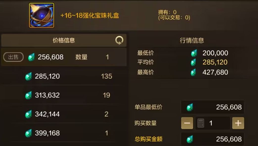 虽然爆率比较低,但本来也属于每天必打的副本,就当顺手为之了。“+16~18强化宝珠礼盒”售价在28万泰拉左右,也算不便宜了,四舍五入刚好可以换一套问鼎天下礼包!