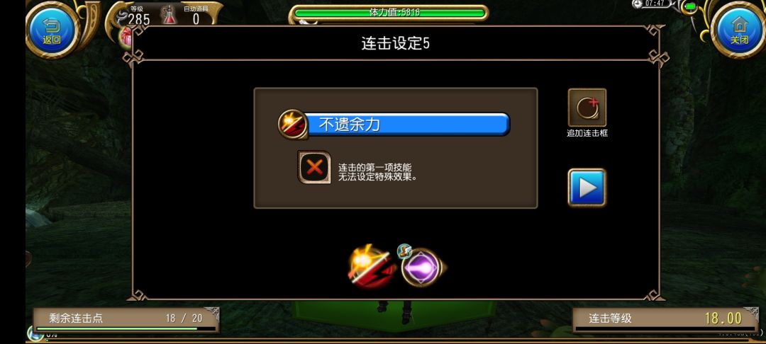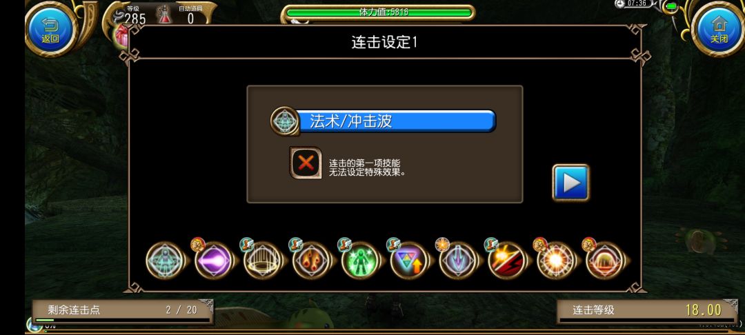 冲击波起手→魔炮(增幅)→结界(迅速)→毁灭(迅速)→魔灌(迅速)→超限(迅速)→法术长枪(无敌)→不遗(迅速)→爆能[增幅(伤害够可换成迅速)]→终结断连