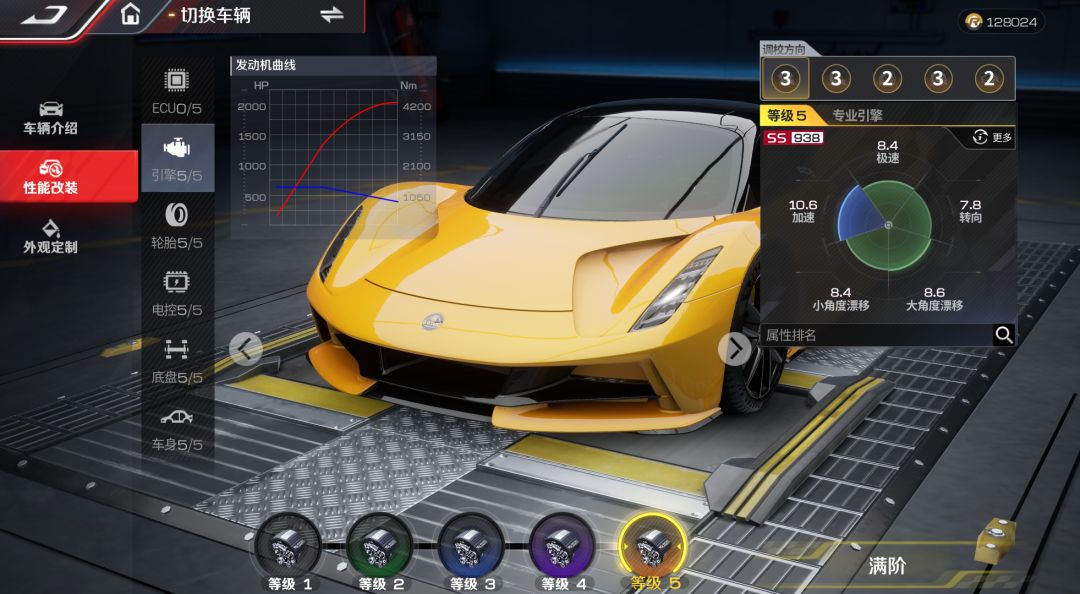 其中ECU是赛车性能改装的关键部分,它可以全面提升车辆的性能,在加速、极速、漂移、转向等性能上优显著的提升,满阶共5阶,升阶所需要的蓝图材料可以通过巅峰车展或商店兑换获得!