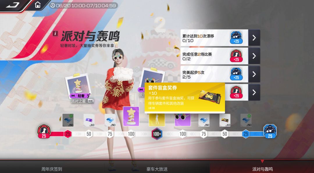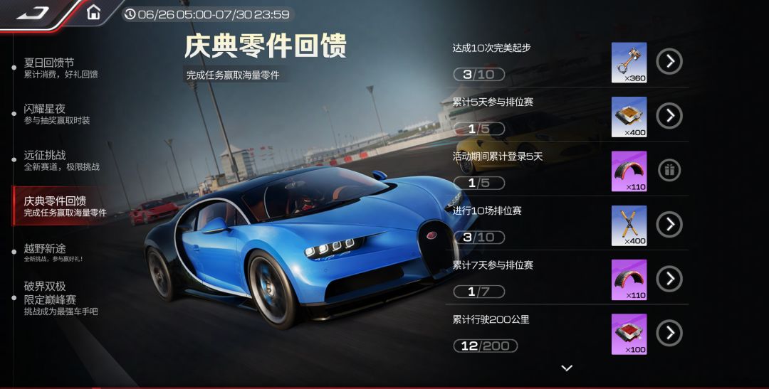 不用担心!现在庆典零件大放送!改装无忧!6月26日5:00-7月30日23:59期间,完成任务就能赢取海量零件!