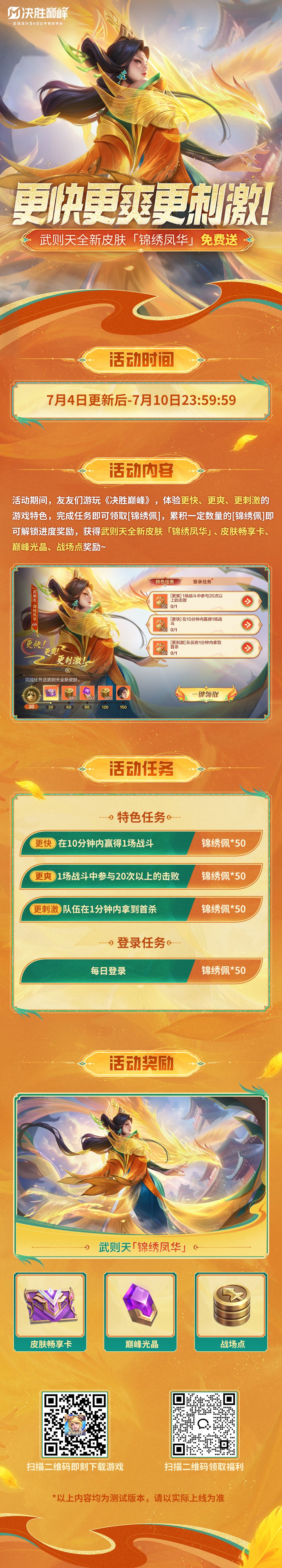 来啦来啦!友友们一直“敲碗”的武则天新皮肤终!于!来!了!武则天全新皮肤「锦绣凤华」将于7月4日正式上线,参与活动免费送~