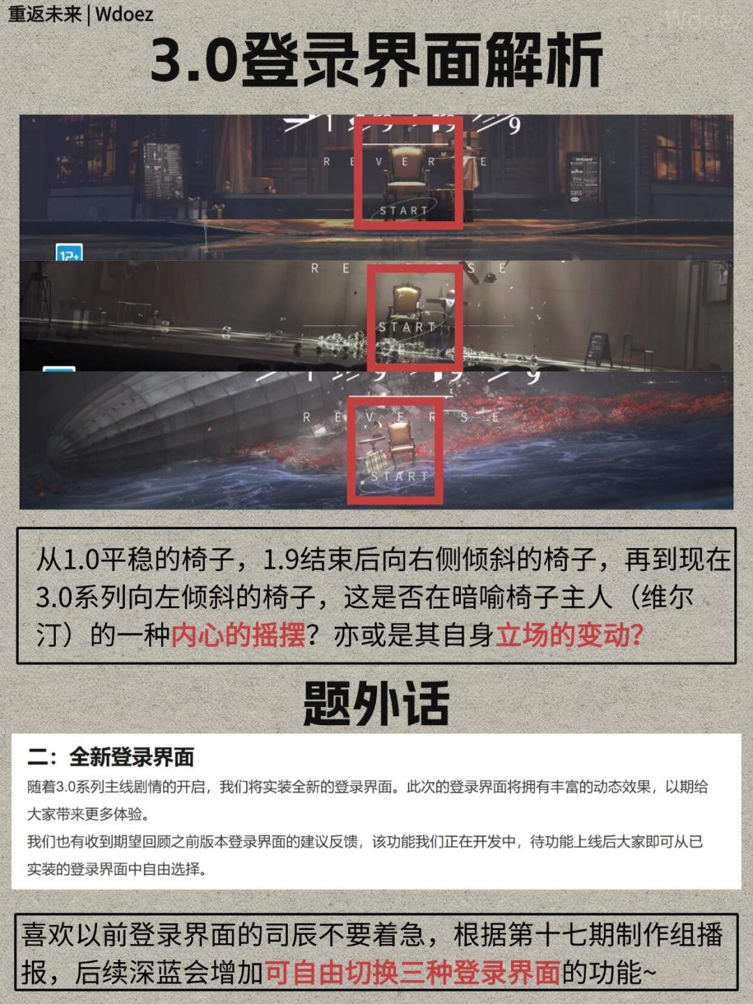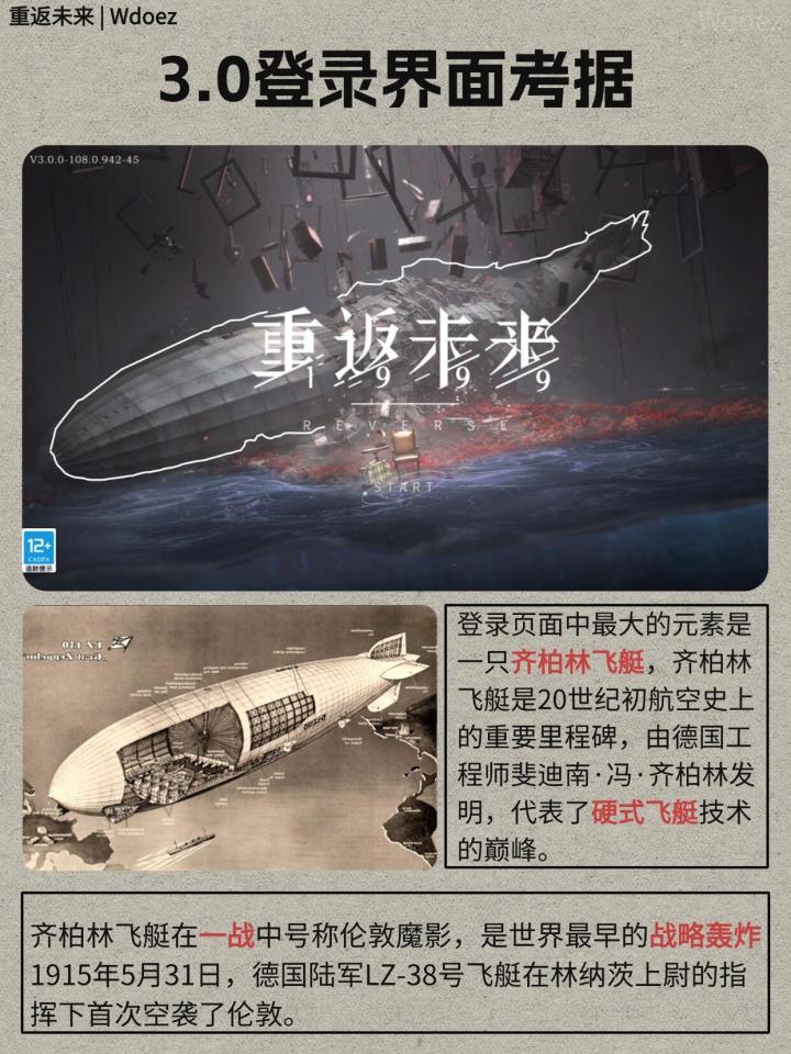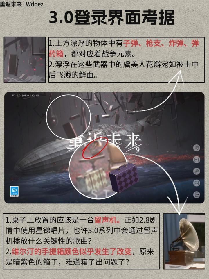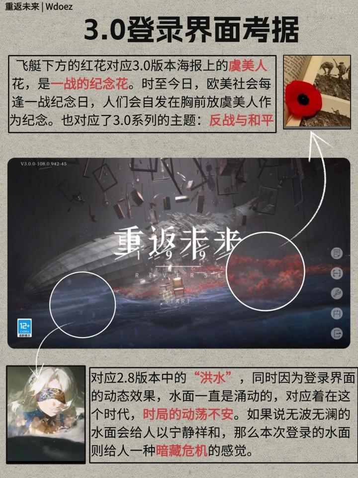 飞艇是一战时的齐柏林飞艇,下方的海水对应着2.8的洪水,花是3.0海报上的一战纪念花虞美人,留声机暂时存疑,三个版本椅子的倾斜我觉得肯定有寓意的,应该是暗示维尔汀的立场变化。