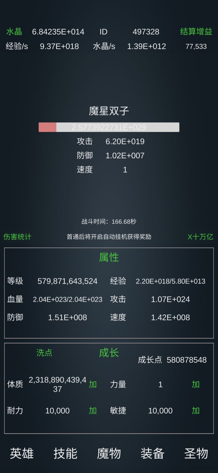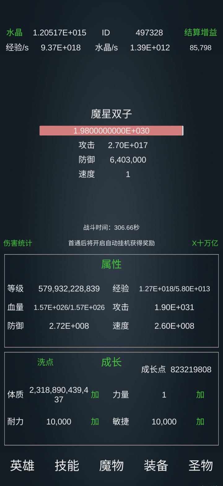开局属性:生命1.49E+20,攻击2.89E+14。