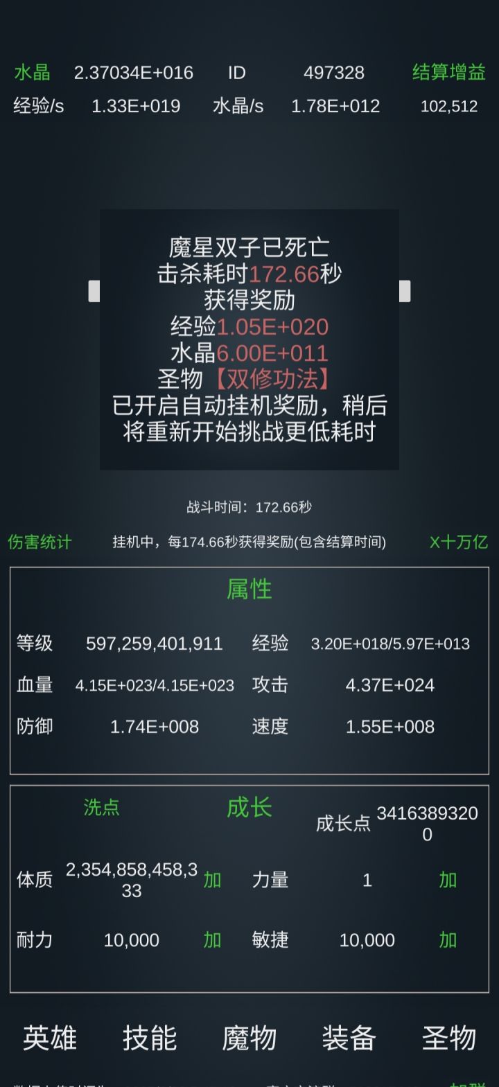 图二是我第一次开赌,开局属性有1.24E+20生命,赌半个小时有机会出一次,与图一相比差了一天,图三是第一次赌的结果,技能没配好最后就会这样。现在想想当时技能配好就过了,如果你也是赌狗