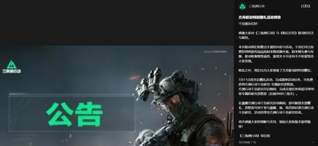 就在刚刚,《三角洲》官方公布了“方舟联动特别赠礼活动预告”,从 7 月 11 日起,完成简单活动任务,可免费获得方洲行动干员研究 - 专属研究资格券:
