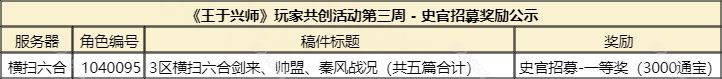 在史官招募活动中,一位【横扫六合】区服的史官记录和分析了各联盟间激烈的战役,本期获奖名单同步进行公示。