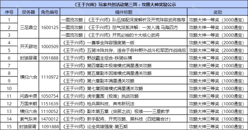 《王于兴师》玩家共创活动第三周,攻略大神们的获奖作品现已出炉!快来看看有哪些稿件获得了创作奖励吧~