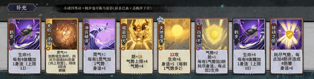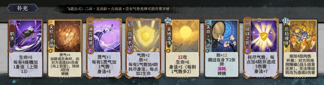 过渡期就不浪费篇幅细讲了,副职卡有几张好用的牌:天运·避凶(既可以抗伤转圈练体,也可反转后配合血光下毒)、血光之灾、天星·御心(下毒),凶象(打纯奶阵容在没有毒时不断给对手上外伤),练气期d一小波,元婴期大d找牌:鹤步,冥影身法,冲霄破浪,磅礴之势,幻岿然不动,崩灭心法,寸劲,连崩,踏破九霄(没有冲浪时)
