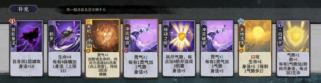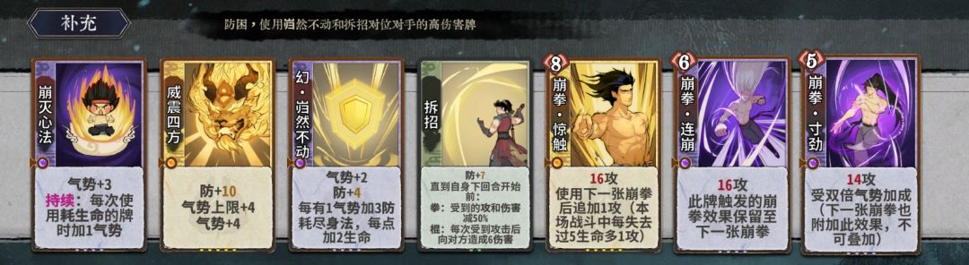 狮子头(威震四方)无论是在命防卡组还是纯崩卡组都非常重要,无脑选;冲浪和身法牌是最终阵容的组件也是化神初期的战力;崩灭心法在元婴拿到时配合崩拳有很强的战斗力,化神期也一直可作为崩灭崩的核心使用;天地浩荡、逆施和磅礴之势只有成型后能用的上,优先级不如前面几位。