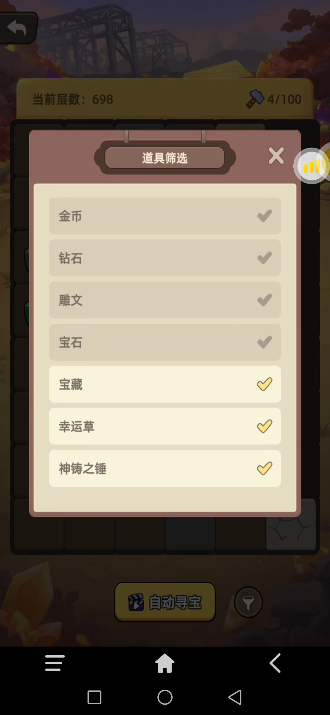 - 秘宝洞窟:里面只需要设置只用勾选宝藏、幸运草、神铸,然后广告自动挖宝就行了,还是很便捷的。