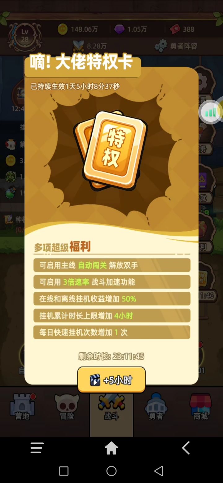 - 战斗闯关:就开着特权卡,无脑挂机,推关就好了,打不过就沉淀一下,强化强化装备,搭配下套装,升级勇者,和勇者技能,没事挂会机,收收菜就好了,还是很佛系的。