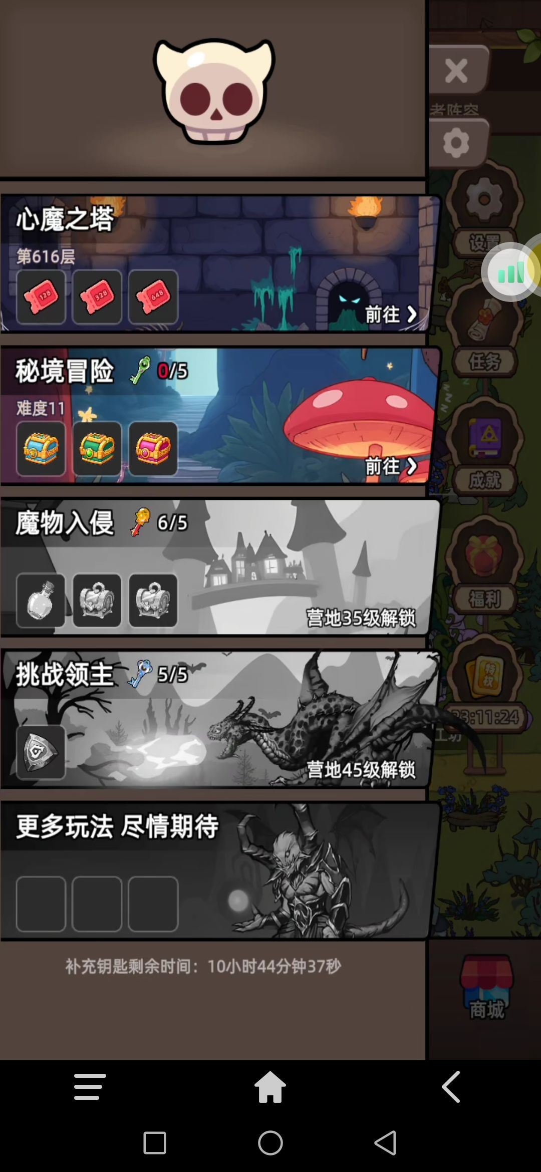 - 资源收集:前期10级左右的时候推图卡住了,就用一次快速挂机,然后继续极限推图,如果推图卡住再用一次快速挂机,就差不多15级了,就可以解锁心魔之塔了