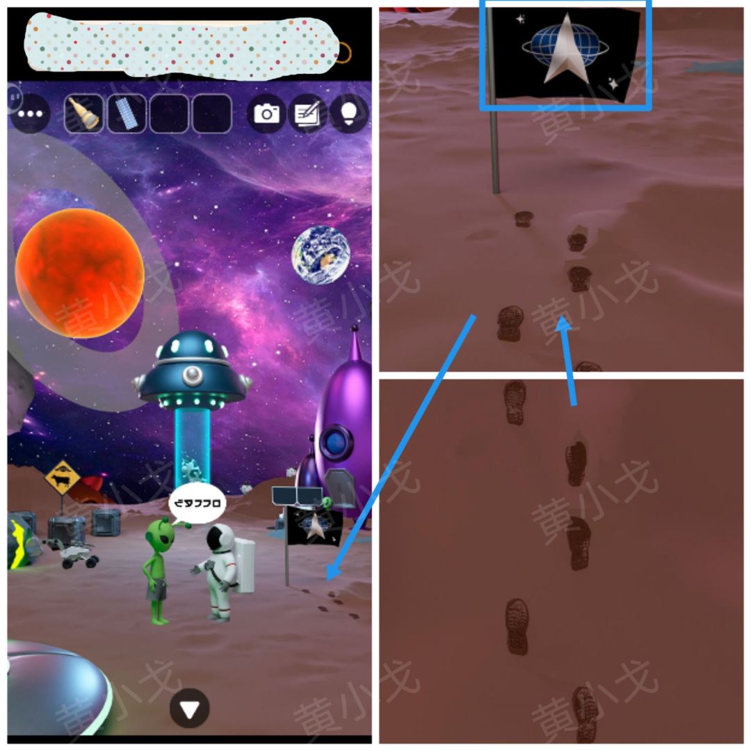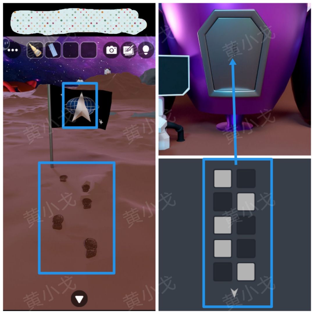 21.点击火箭门上的密码锁,根据上面的指针图案提示,结合地上的脚印线索,调整密码锁