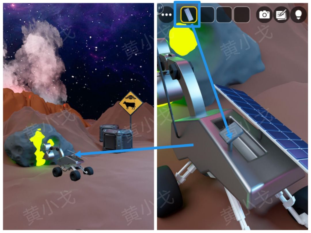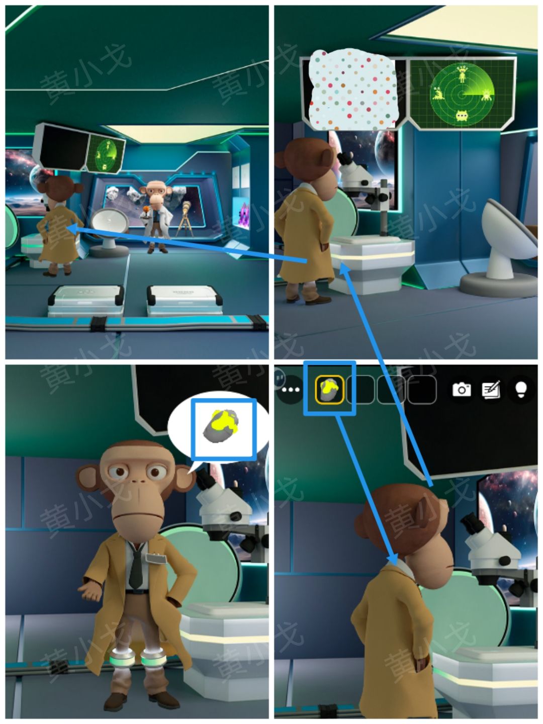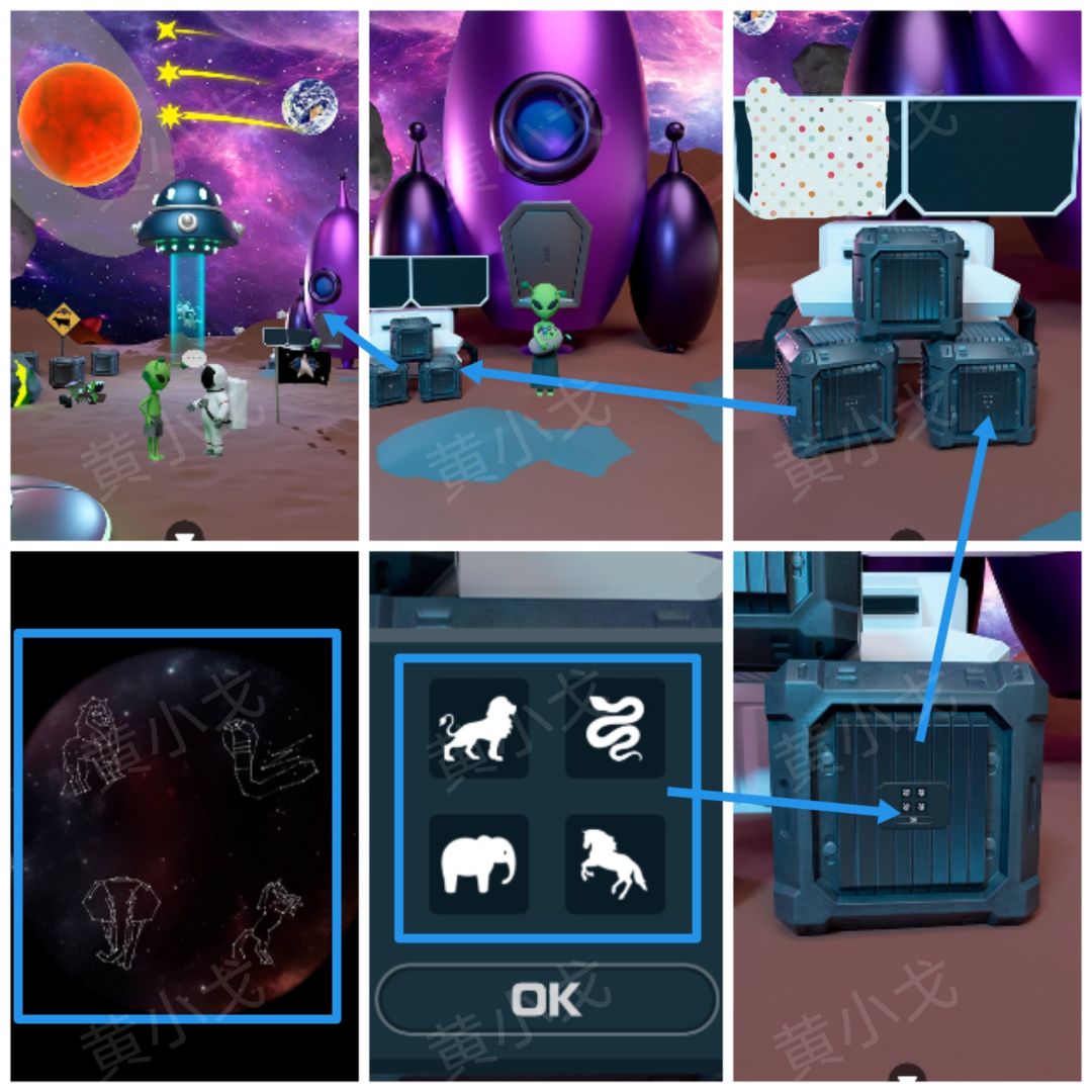 12.点击火箭旁边的右侧箱子上的密码锁,根据[猴子]场景通过望远镜得到的星座线索,调整密码锁