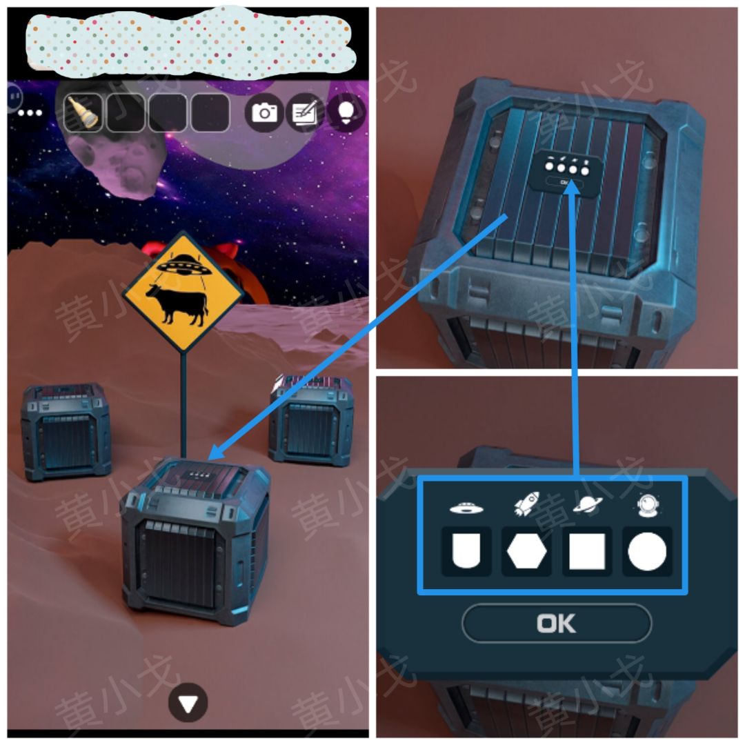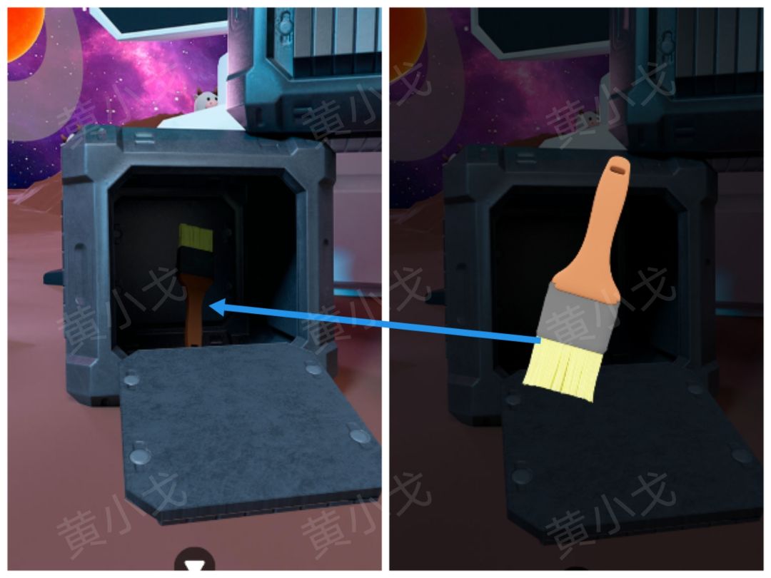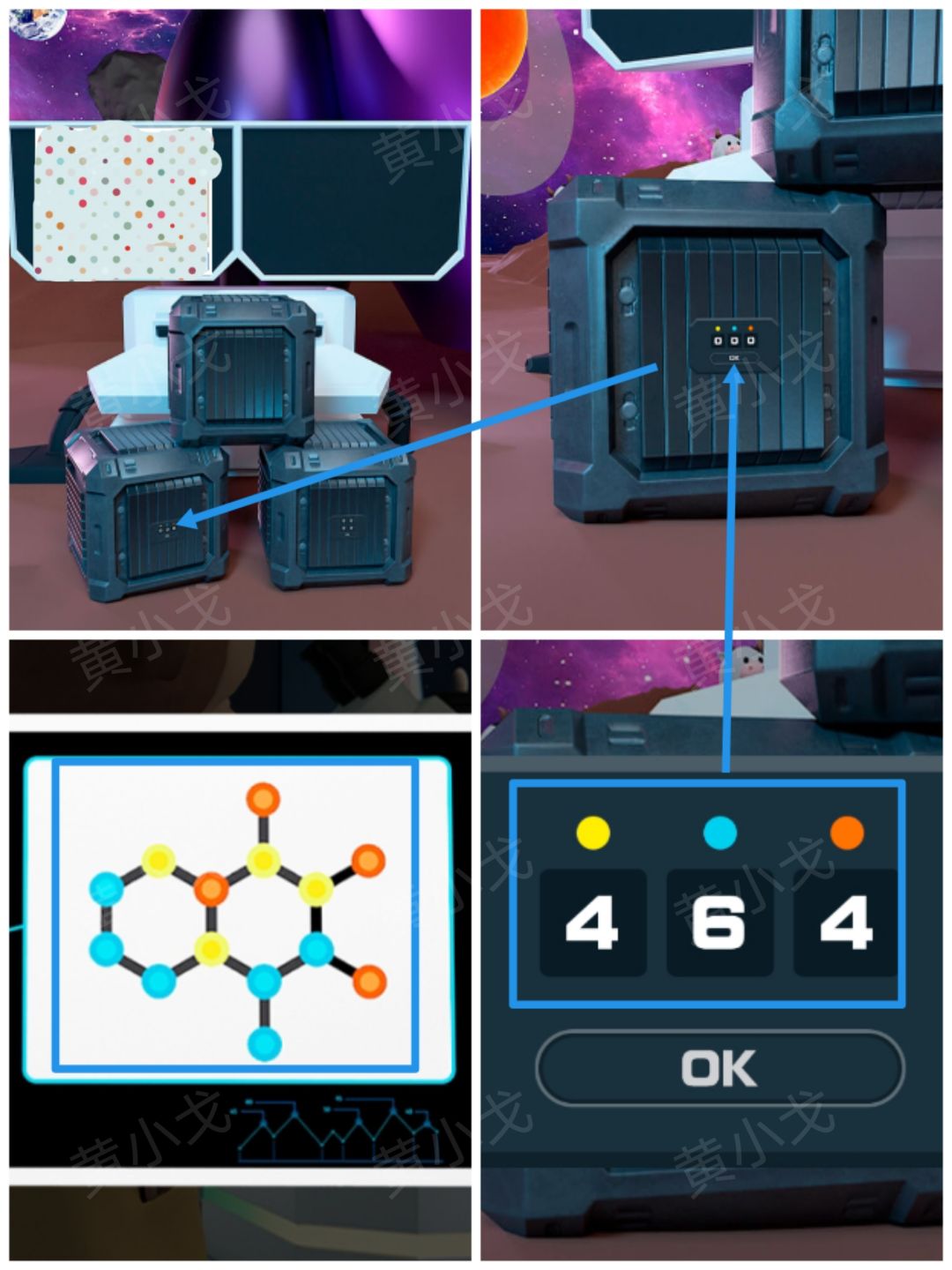 4.点击中间的箱子上的密码锁,根据上面的图案提示,结合[宇航员]场景宇航员徽章上的图案及徽章形状线索,调整密码锁