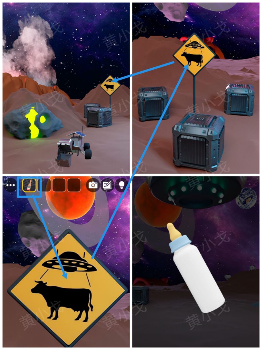 19.点击标识牌,用【刷有油漆的刷子】刷上禁止通行标识;解救奶牛,获得【奶瓶】