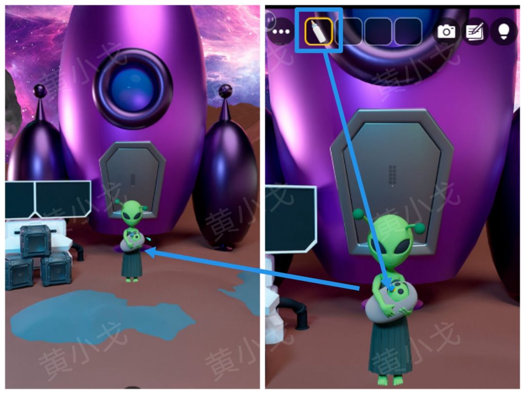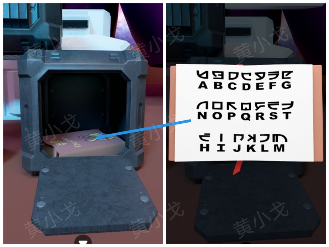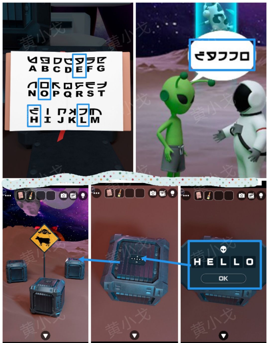 16.点击地上的右侧箱子上的密码锁,根据上面的外星人图案提示,结合通过【翻译本】翻译外星人说的话,输入密码:HELLO