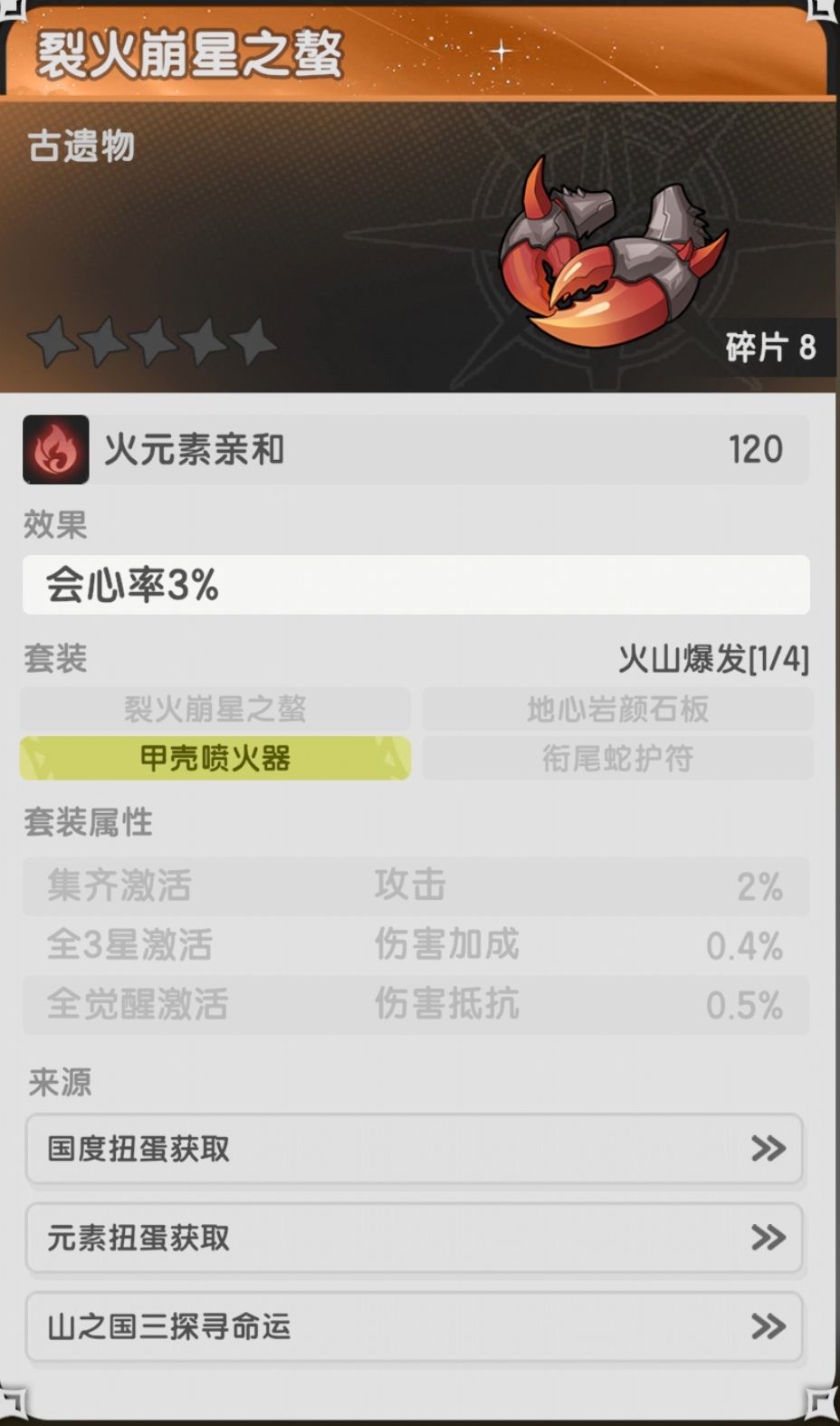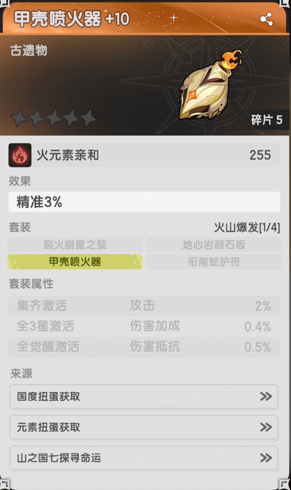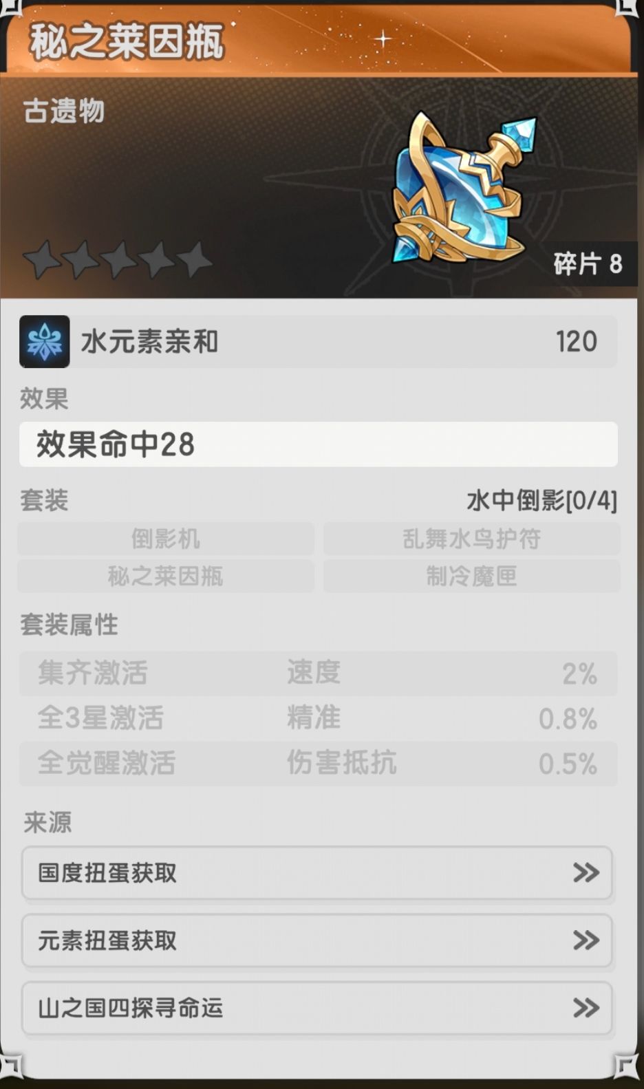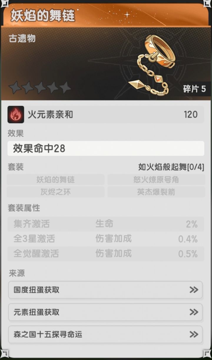 山一:水晶之旋螺(水庇护,生命),山三:古兽化石(火庇护,生命)裂火崩星之螯(火亲和,会心率◐),山四:蚌壳居(水庇护,生命)秘之莱因瓶(水亲和,效果命中★),山五:魔能车轮(暗庇护,生命),山六:万魔殿金砖(暗亲和,生命),山七:魔力玩偶(暗亲和,生命)甲壳喷火器(火亲和,精准3%▲),山八:白金星纹手套(光庇护,生命),山九:机关迅箭(风庇护,生命),山十一:雷光大锤(光庇护,生命5%),山十二:石像的断臂(暗亲和,速度),山十三:风魔雕刻刀(风庇护,生命),山十四:命运的大旗(风亲和,元素精通),山十五:星荧羽笔(光庇护,生命)火核环绕之轮(火庇护,生命)倒影机(水亲和,元素精通),山十六:巨蜂刺(风亲和,元素精通),山十八:放逐者枷锁(暗亲和,攻击)