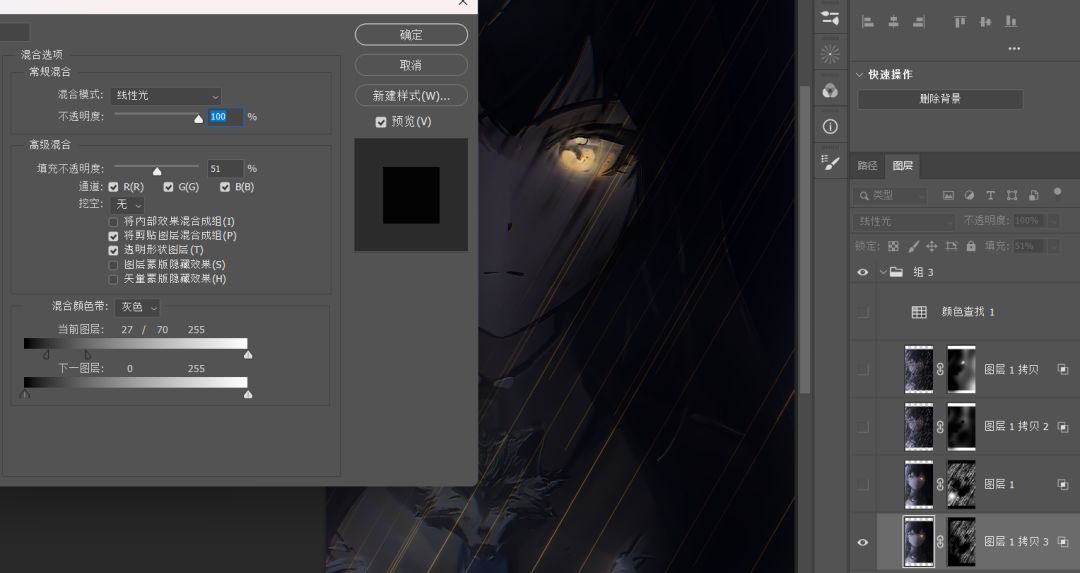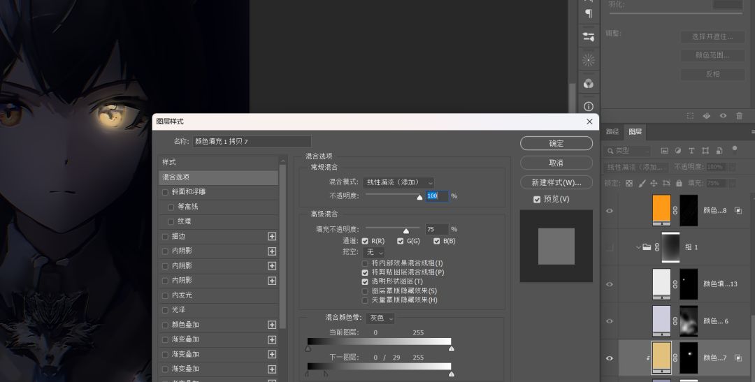 1.纯色+蒙版>线性减淡+75填充>混合颜色带调整