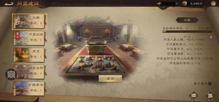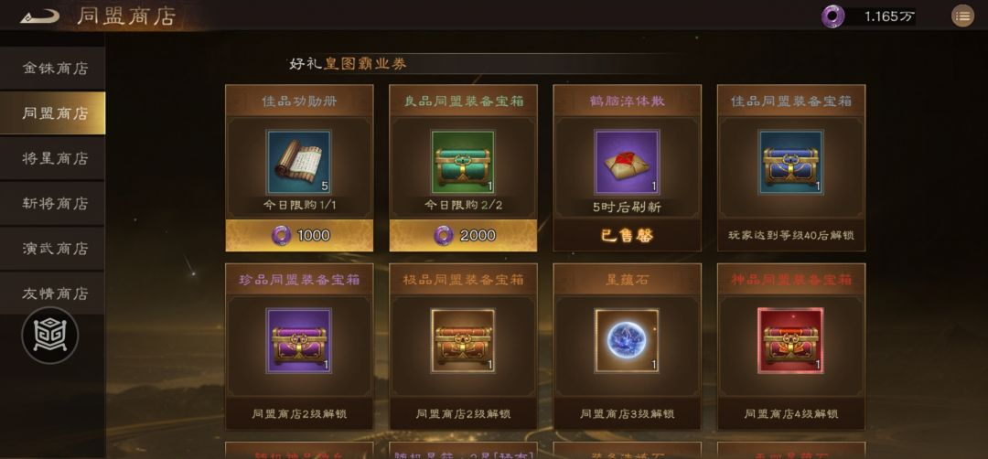 同盟建设:一般开始就主升大殿,好处是能扩容军团成员的数量,毕竟团抱的越大越暖和,同盟商店升到5级会开放随机神兵,也是值得买的点,还有就是那个一天一刷新只能买一次的鹤药必须买,练体玩法本来就升级慢,不能放过同盟商店这点药,慢慢积累。