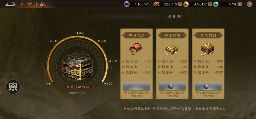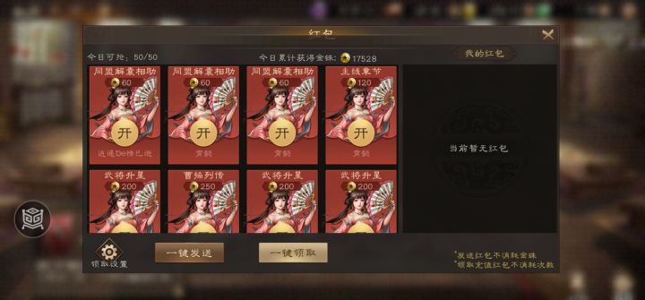 除了充值红包外其他红包是有领取上限的,比如武将升星等都有资格发红包,如果你的盟红包也很多,不妨在红包界面左下角设置下,既然领取次数优先,就设置成只抢大包,这样获得的金珠数量更多些,都是小细节,一般设置150就可以了。每天捐献全部拉满,别心疼,大家都拉满是不会亏的,这点团结心还是要有的,共同建设,心往一处想,劲往一处使,蛋糕做大了每个团员都能吃饱穿暖!