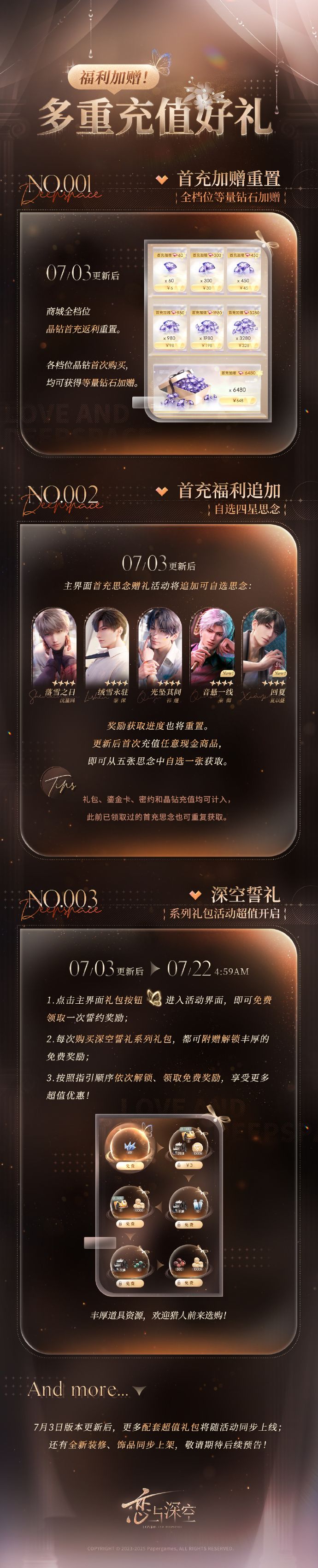 7月3日更新后,主界面首充思念赠礼活动将追加可自选思念「秦彻·音悬一线」、「夏以昼·回夏」