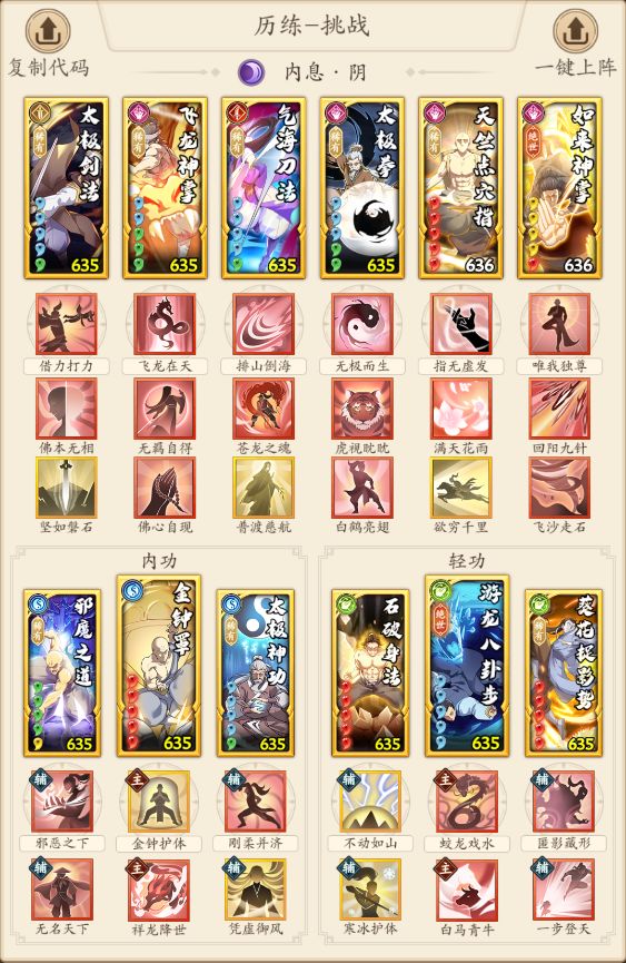 ③如敌方携带葵花捉影式导致我方太极剑法被封,可将点穴下任意一招式替换为不药而愈,同理,若敌方使用飞龙神掌、流云十三式导致我方太极拳下后手无法触发时,可将佛心自现替换为不药而愈。