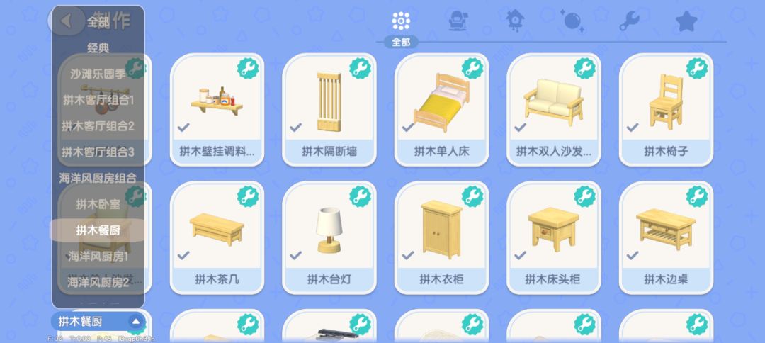 2.回家到制作台制作,现在太多家具了,有个快速查找的技巧方法,左下角选套装,分别在“拼木客厅组合2“,“拼木卧室“,“拼木餐厨“分类里。