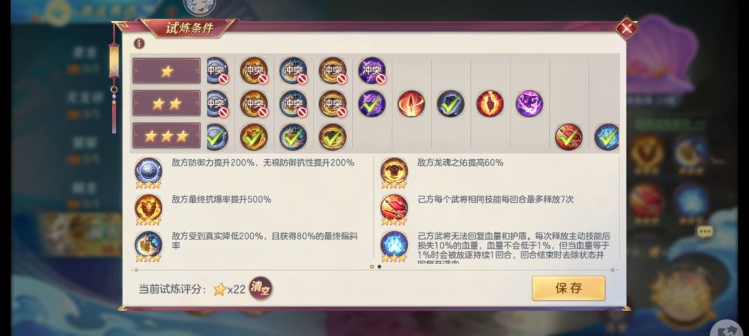只需要打一把就能拿完奖励了,注意先点满8个试炼条件,一共是22星,然后直接配置好阵容,一把就能5000万。注意神兵和灵宠要用对。