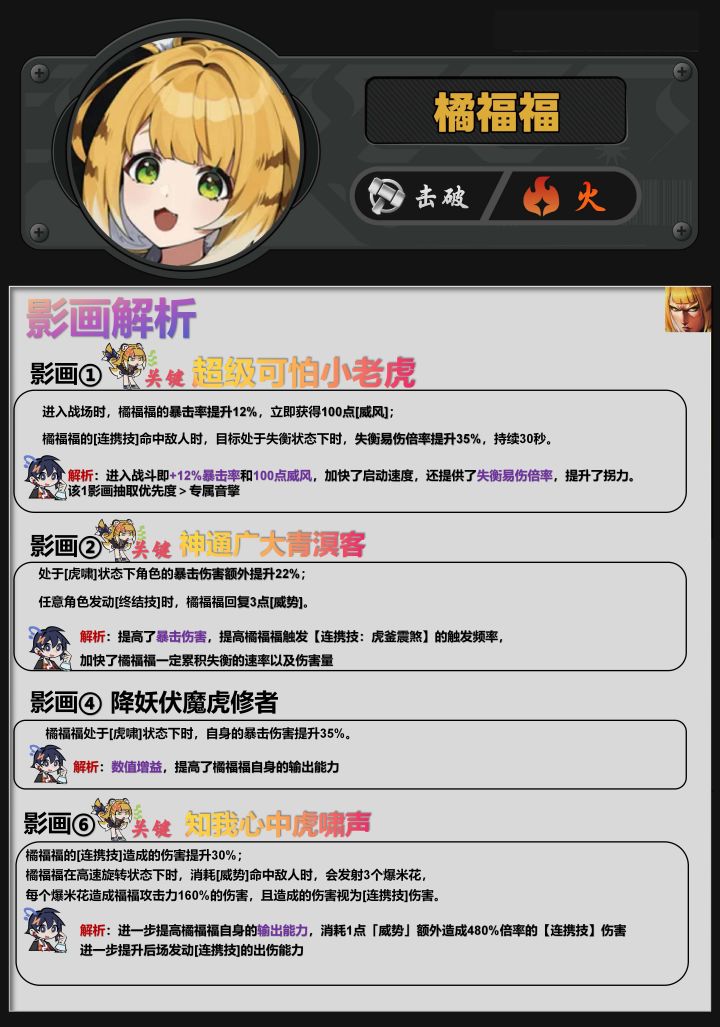 「橘福福」是S级后台辅助【击破】火属性代理人,通过累积并消耗「威风」在后台自动释放【连携技】为队伍持续对敌人累积失衡值的同时使全队获得「虎啸」,还可为全队提供暴击伤害加成&提高【连携技】、【终结技】的伤害。