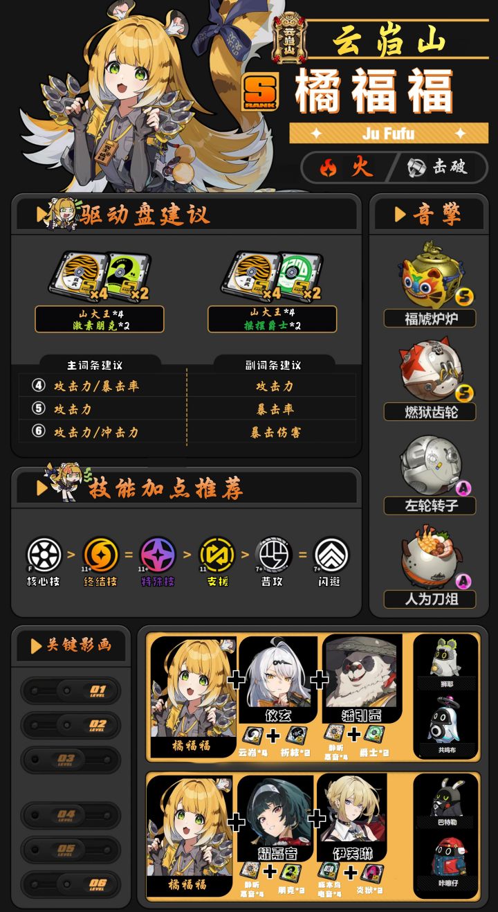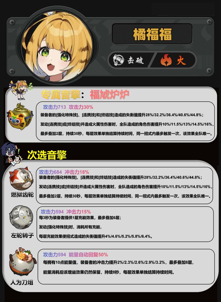 音擎推荐:优先推荐专属音擎【福虓炉炉】,提供高达30%的攻击力,降低了驱动盘攻击力的词条压力;且提升了橘福福的主要招式[强化特殊技]、[连携技]、[终结技]所造成的失衡值以及全队增伤