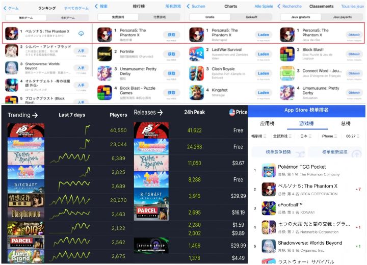 P5X国际服上线24小时内迅速登顶12国免费榜,包括日本、美国、英国等主要市场,甚至在日本App Store总榜拿下第一(如图二)。Steam国际服同时在线峰值突破4.1万人,超越《女神异闻录5:皇家版》纪录。尽管部分玩家反馈优化问题,但游戏仍获得77%好评,许多玩家认为能在手机上免费体验正统P5玩法已是一大福利。